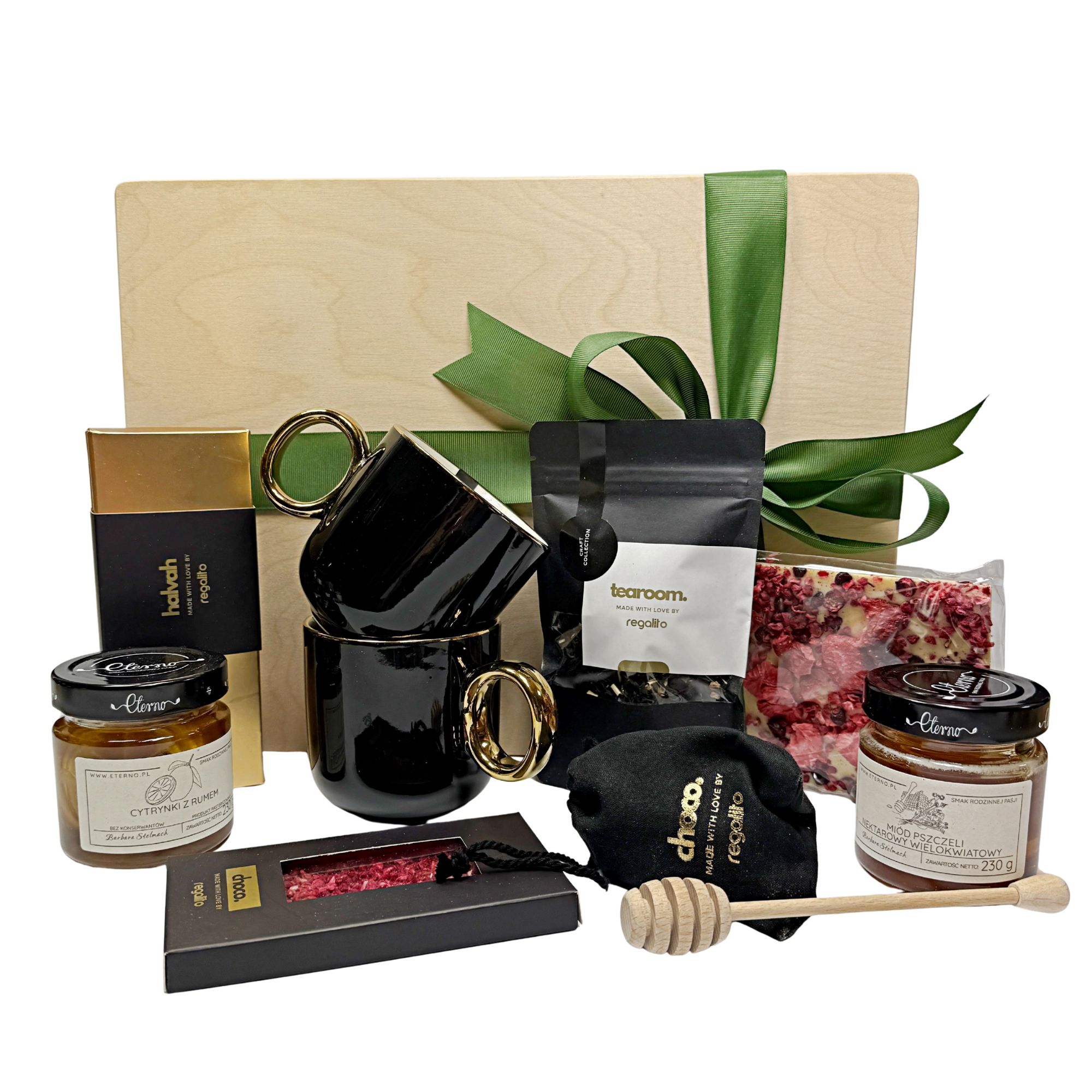 Zestaw produktów w drewnianym pudełku prezentowym z opcją personalizacji: