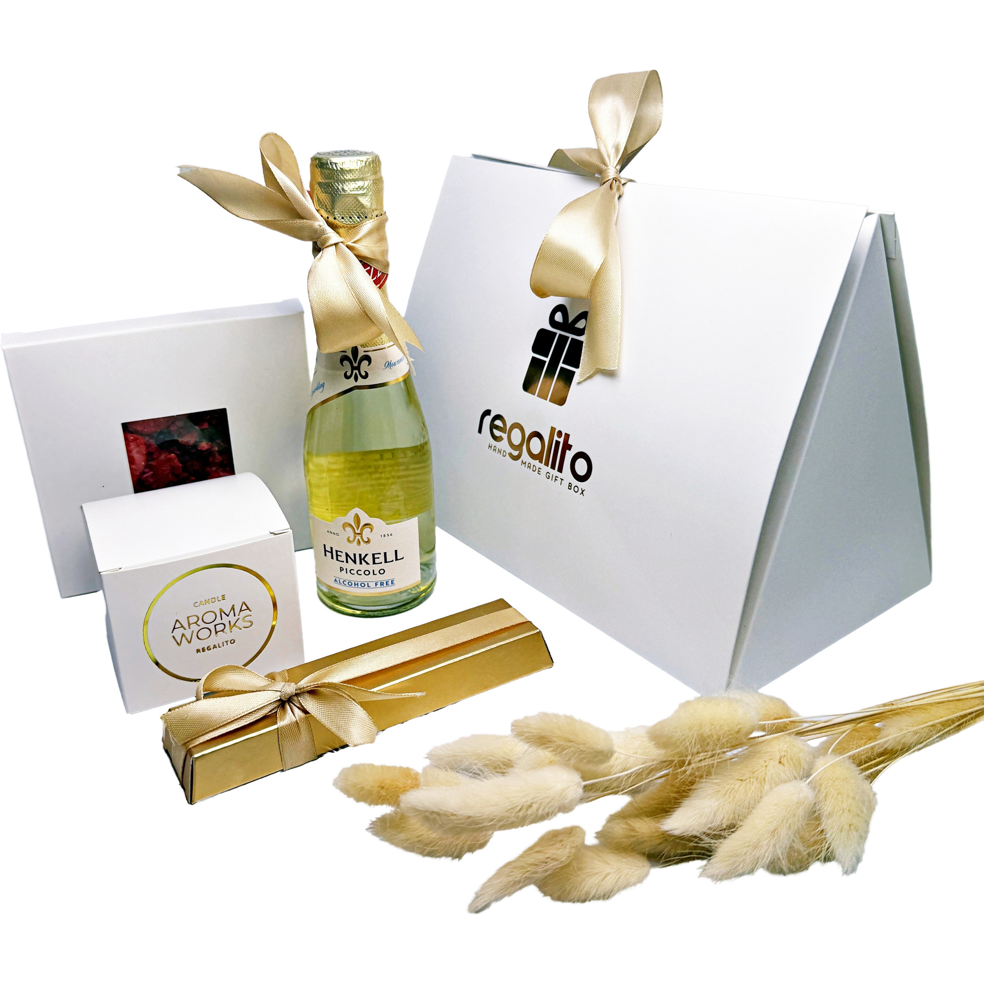 Elegancki design spotyka funkcjonalność Te pudełko upominkowe wyróżnia się na tle tradycyjnych modeli dzięki wyjątkowemu kształtowi, elegancko przypominającemu małą torebkę. Wykonane z matowego kartonu, w połączeniu z dołączoną złotą wstążką satynową, tworzy ponadczasowy i ekskluzywny wygląd. Gdy wstążka jest zawiązana w elegancką kokardę na górze, podkreśla wykończenie i potęguje luksusowe wrażenie. Konstrukcja składana zapewnia klientom niezapomniane doświadczenie podczas rozpakowywania.