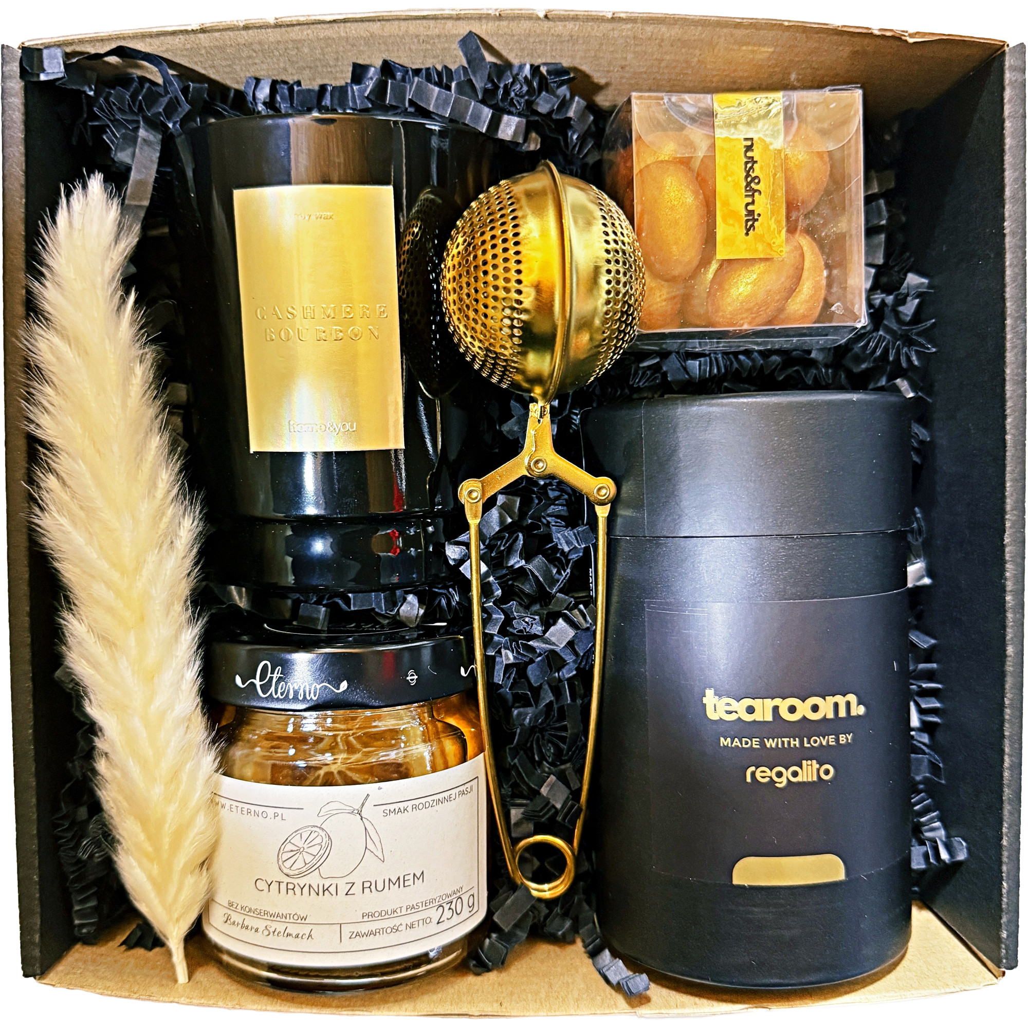 Zestaw produktów w eleganckim pudełku prezentowym z obwolutą i wstążką, z opcją personalizacji: